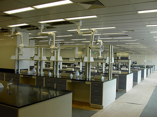 在中央臺和邊臺上,安裝試劑架,萬向支架,用來放置根據(jù)不同實驗目的的反應管,抽取管等器具。另外在實驗臺上要引入特殊氣體配管,以及作為冷卻用的給排水管,在通分柜內(nèi)部也可安裝固定器具的萬向支架。